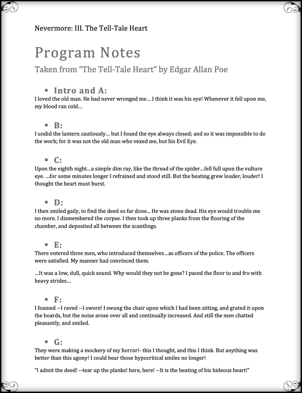 This dramatic, challenging chamber work recounts the emotions coursing through Edgar Allen Poe’s classic works, “The Raven,” “Annabel Lee,” and “The Tell-Tale Heart,” with modern, neoromantic flair.
