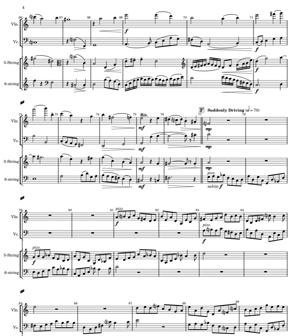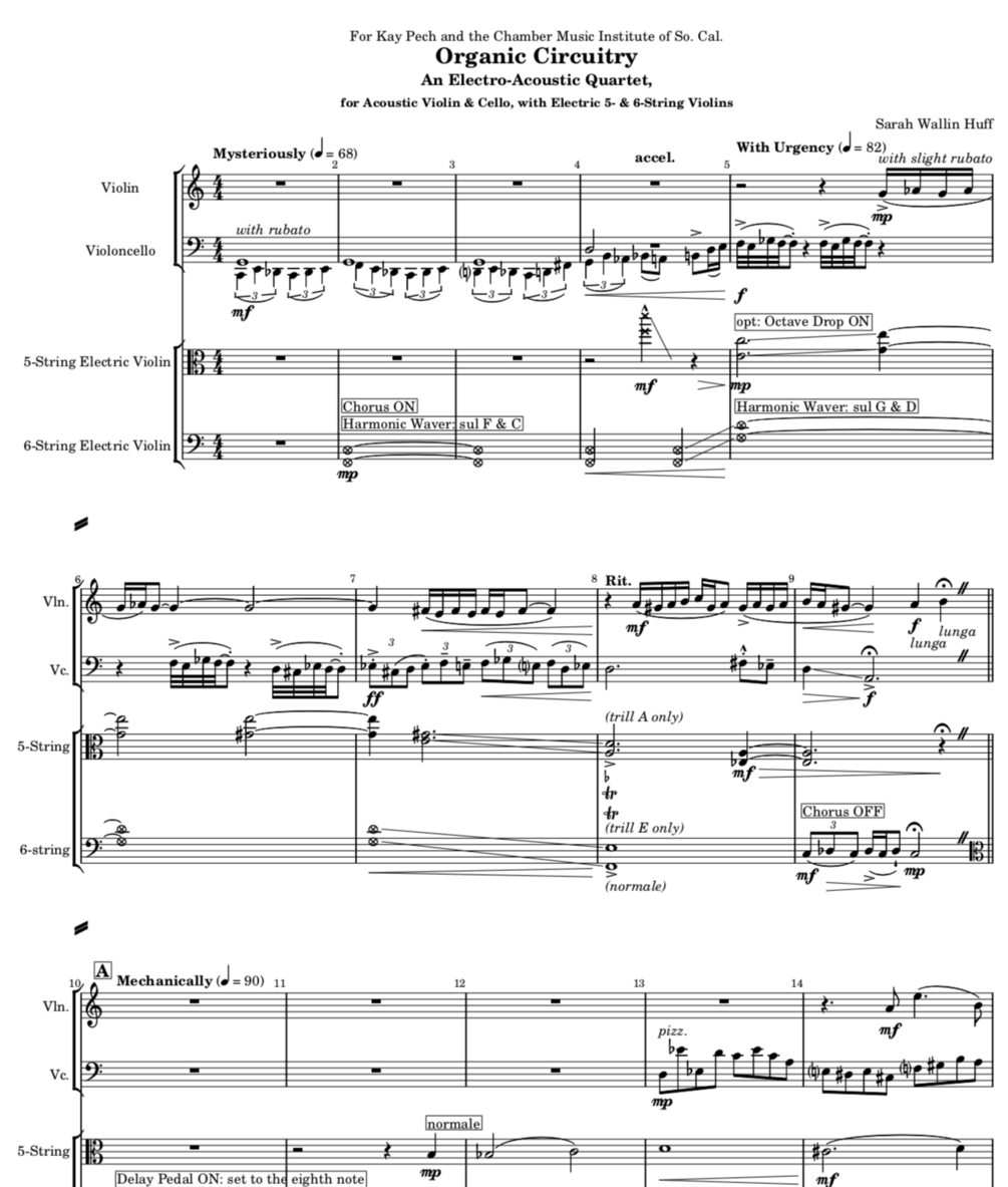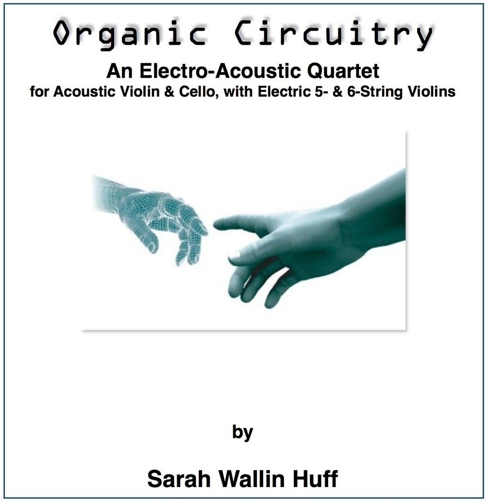 Organic Circuitry, an Electro-Acoustic Quartet for violin, cello, 5-string electric violin (with Octave Drop pedal), and 6-string electric violin (with Chorus and Delay pedals). 6 minutes. (2014) Composed for Kay Pech and the 2014 Chamber Music Institute of So Cal; performed in concert at the CMI Summer Chamber Music Gala on 7/20/2014 in Cerritos CA.