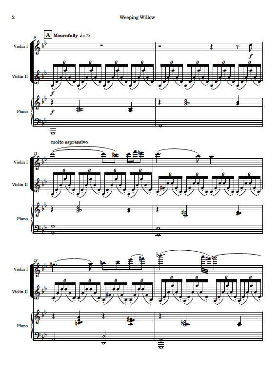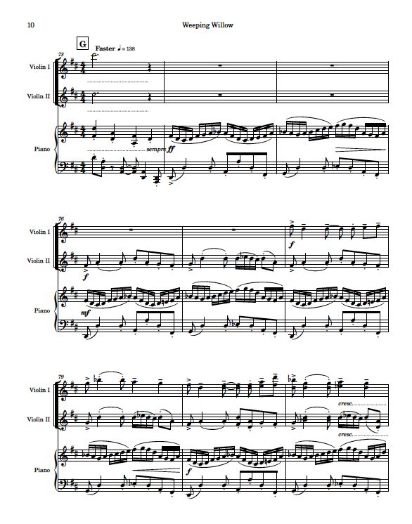 “Weeping Willow” is a dramatic, soulful work for: two violins and piano, or for clarinet, cello, and piano. Calling upon the Jewish heritage of similar works (like Ernest Bloch’s “Baal Shem” and John Williams’ music for “Schindler’s List”), this trio explores passionate worlds of texture, from drawn-out, twisting melodies of heartbreak to the fury of driving, desperate passages. Completed in 2016, “Weeping Willow” runs about 6.5 minutes long.